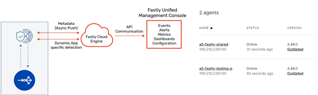 In Fastly's terms, the ADC device implements a Module and Agent pair that interact with the requests made to the servers. This pair is responsible for performing detection and decisioning against requests (application traffic), to allow the request through to the application or log/block it (depending on the mode set in the configuration). Also, the cloud engine from fastly offers a cloud-hosted analytics backend that enriches the agent asynchronously with intelligence gathered from external and proprietary sources to make dynamic, application-specific detections.