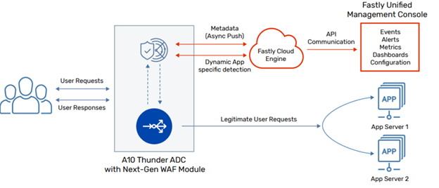 In this sense, Fastly module-agent pair is integrated with Thunder ADC devices, to provide an efficient point of protection for the web services, without adding load to the web application servers. The Thunder ADC device still works as a load balancing device, while streaming metadata to the Fastly Cloud Engine as required.