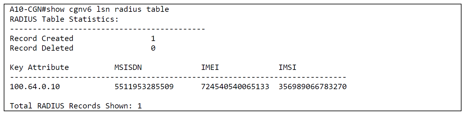 A10 can function as a RADIUS server that relies on a mobile RADIUS to send account-start and account-stop messages. It then locally stores the RADIUS data, including the framed-IP, in a RADIUS table. After the RADIUS server authenticates the user and sends the accounting data to the CGN, the table is created and the information is stored. This data remains until the RADIUS server sends the account-stop message, freeing up the entry. In the following output, you can see this radius table created into the A10 CGN