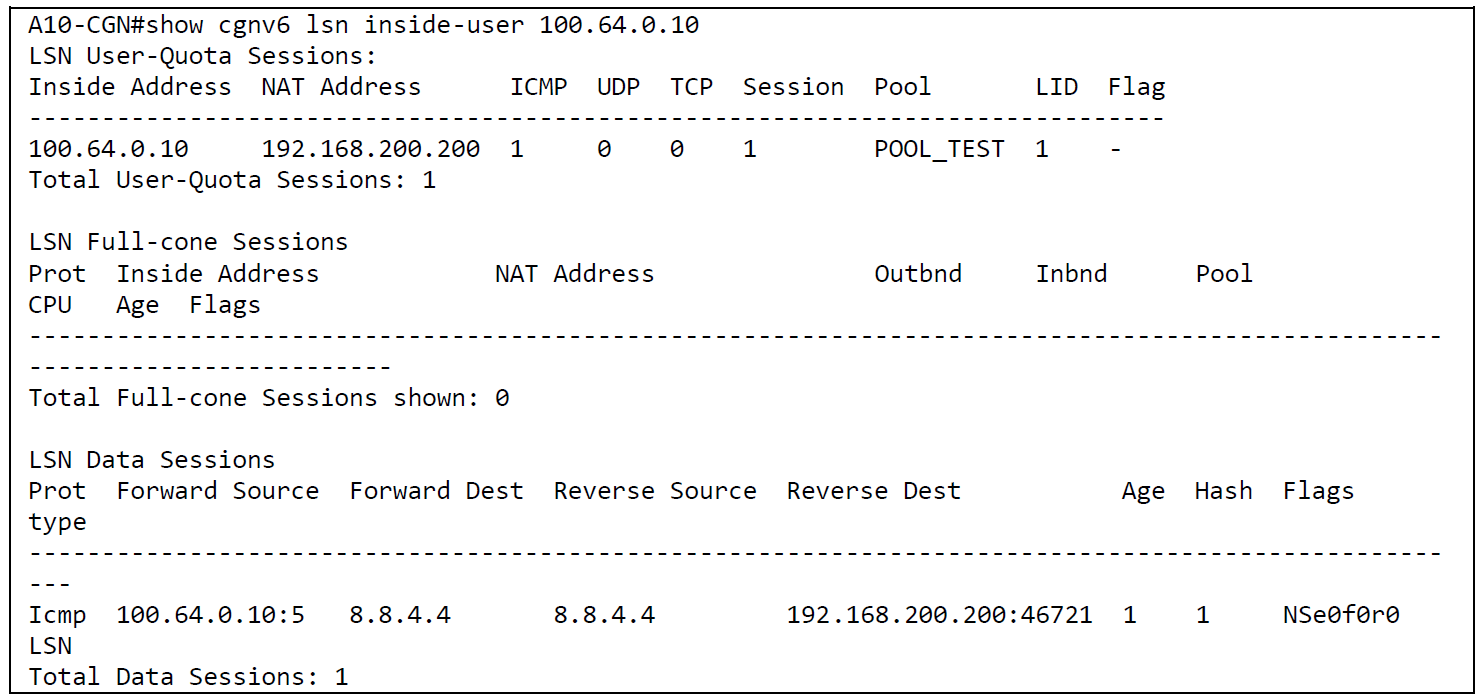 On the other hand, when a subscriber generates traffic and is NATed in the CGN, a port-mapping occurs and is stored as a BIB in the data session table. This maps the public port and public IP to the respective inside-IP and inside-port, if applicable. In the following output, you can see this mapping in the LSN data session, where the NATing takes place.