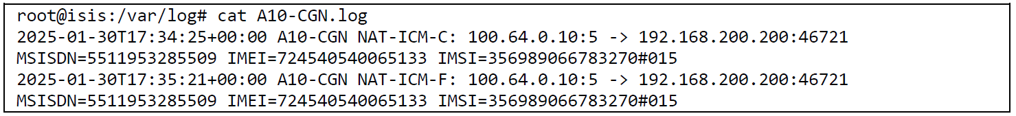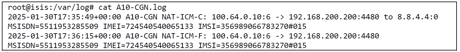 At this point, you may notice that these two network components hold partial communication data that must be stitched together for investigation purposes. RADIUS provides user details like IMSI and inside-IP, while CGN logs the inside-IP, public IP, port, and timestamp of resource usage. Combining this data is typically a task for operators, requiring manual parsing and merging. However, A10 Networks systems automate this process, seamlessly combining the data into a single log entry for storage, reducing the customer's need to create or maintain complex data handling processes.