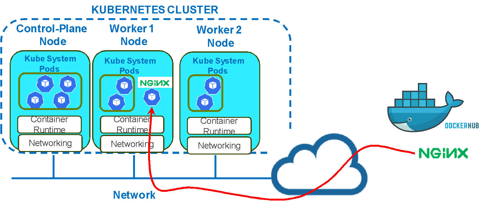 We just finished doing our first reconnaissance of our Kubernetes cluster lab. Now we are ready to deploy our first pod. We are going to deploy a NGINX container. A container registry is needed to download the images. The container registry is external to the Kubernetes cluster. By default Kubernetes looks for an image in https://hub.docker.com which is a public and free container registry.