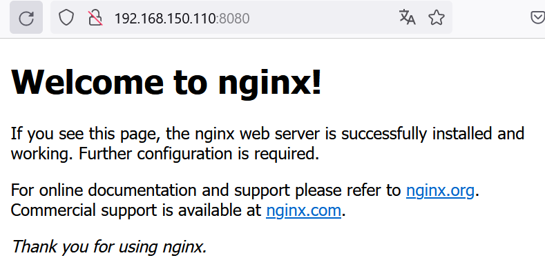 Now we can use any PC that has connectivity to our host 192.168.150.110. We browse to http://192.168.150.110:8080 and we get the “Welcome to nginx!” message.